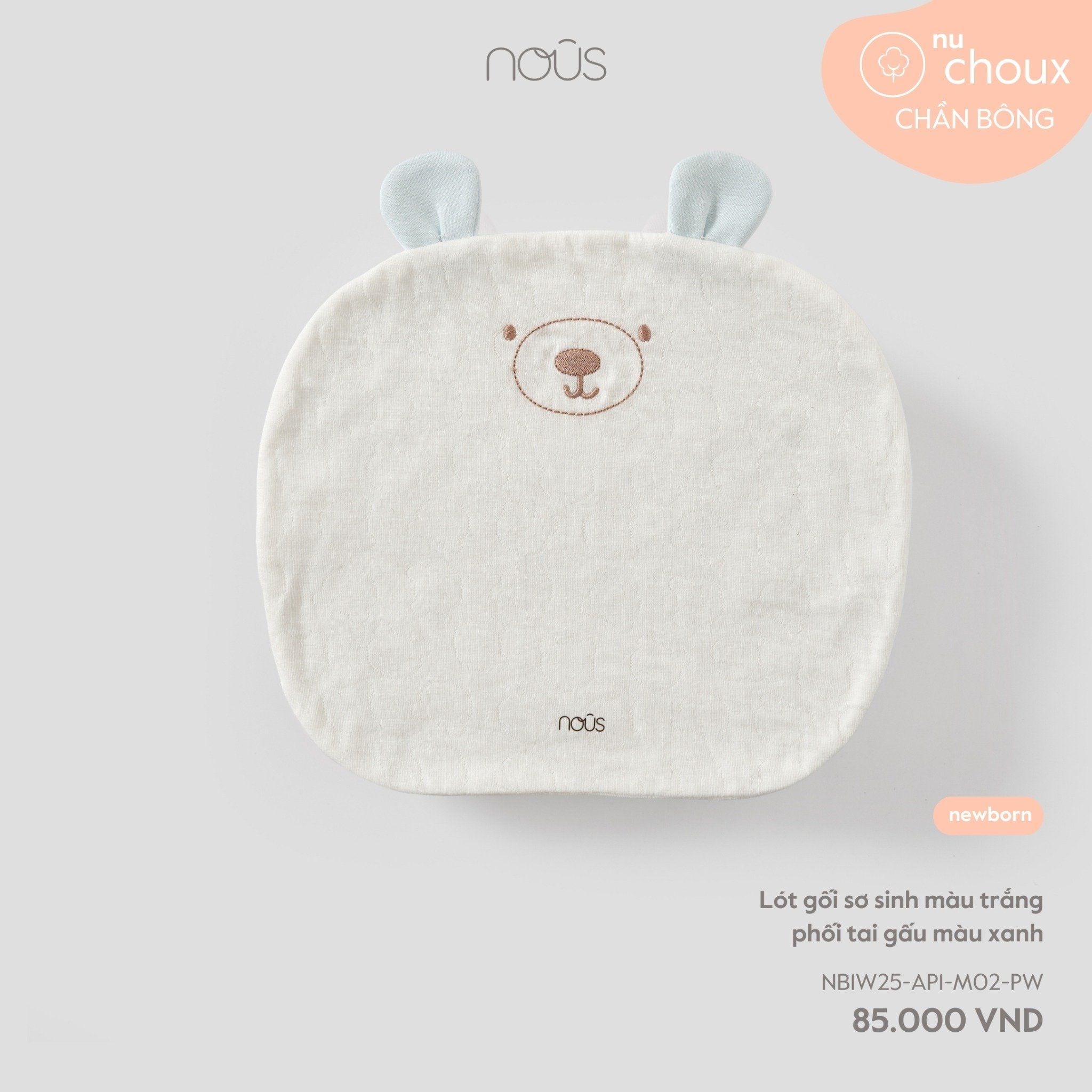 Thiết kế: Lót gối có kiểu dáng hình vuông bo góc nhã nhặn với tông màu trắng tinh khôi. Điểm nhấn là đôi tai gấu màu xanh pastel đính phía trên cùng hình thêu mặt gấu nhỏ xinh, ngộ nghĩnh ở giữa. Thiết kế mỏng nhẹ theo tiêu chuẩn dành riêng cho trẻ sơ sinh, giúp nâng đỡ đầu bé một cách tự nhiên mà không ảnh hưởng đến cấu trúc xương cổ non nớt.