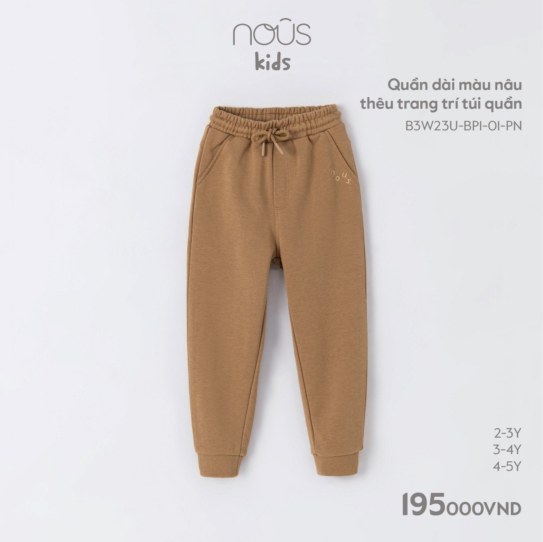 Thiết kế: Dáng quần dài bo gấu (jogger) khỏe khoắn, giúp cố định ống quần khi bé vận động. Sắc nâu tây nhã nhặn, dễ dàng phối hợp với nhiều phong cách áo khác nhau. Điểm nhấn là chi tiết thêu chữ “Nous” tinh tế bên hông túi và dây rút trang trí tại thắt lưng. Cạp chun co giãn đa chiều, ôm form thoải mái mà không gây hằn bụng, kết hợp cùng túi hai bên tiện lợi.
