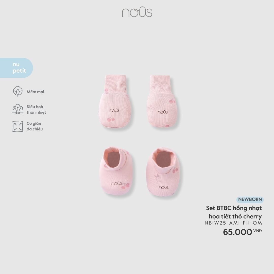 Thiết kế: Set phụ kiện bao gồm bao tay và bao chân (BTBC) với sắc hồng nhạt ngọt ngào. Điểm nhấn là họa tiết thỏ và cherry in nhỏ nhắn, xinh xắn cùng logo Nous tinh tế. Thiết kế bo thun mềm mại, ôm vừa vặn cổ tay và cổ chân bé, giúp cố định chắc chắn mà không gây lằn hay đau da, bảo vệ bé khỏi việc tự trầy xước mặt và giữ ấm đầu mút tay chân.