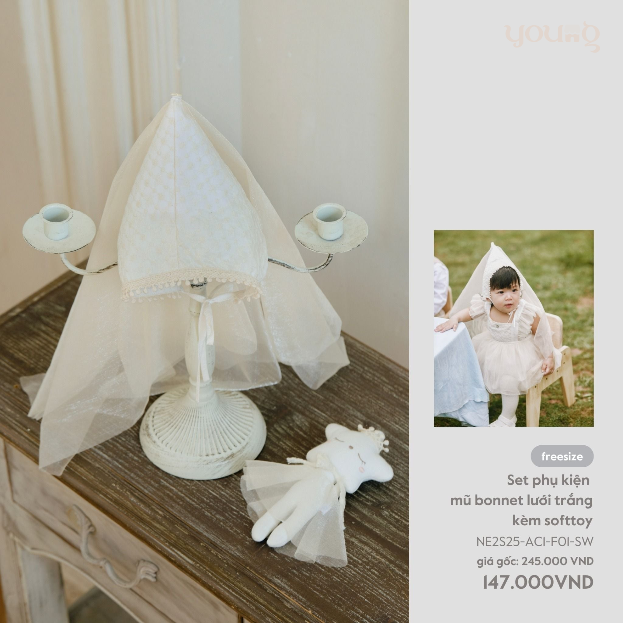 Thiết kế: Mũ Bonnet dáng cổ điển phối lớp lưới dài mềm mại, tạo hiệu ứng bồng bềnh và sang trọng. Đi kèm là Softtoy (đồ chơi vải) hình ngôi sao mặc váy voan đồng bộ, là người bạn nhỏ đáng yêu bên bé.